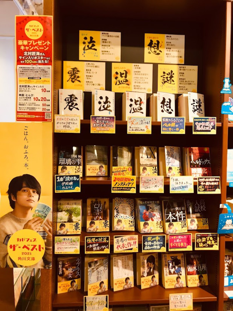 今年の総まとめ、角川文庫のフェア開催しております。豪華プレゼントキャンペーンつきの角川文庫フェアは、北村匠海さんのポスターが目印。泣ける本から心温まる本まで幅広いラインナップです。2F文庫11番の棚の向かい側で12月下旬まで展開中です。