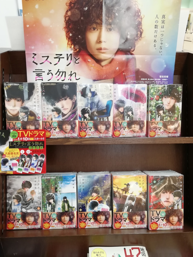 10巻の発売と来年1月からのドラマ化を記念して、『ミステリと言う勿れ』(小学館)の既刊&最新刊を取り揃えたフェアを開催中です。ミステリ好きの私も、初めて少女コミックを買って現在どハマリ中です。ドラマのスタートまではまだ時間はありますし、巻数も10冊とまとめ買いが十分可能です。当店もしっかり在庫を確保しておりますので、菅田将暉さんの看板を目印にして、お買い求めはさんちかで。