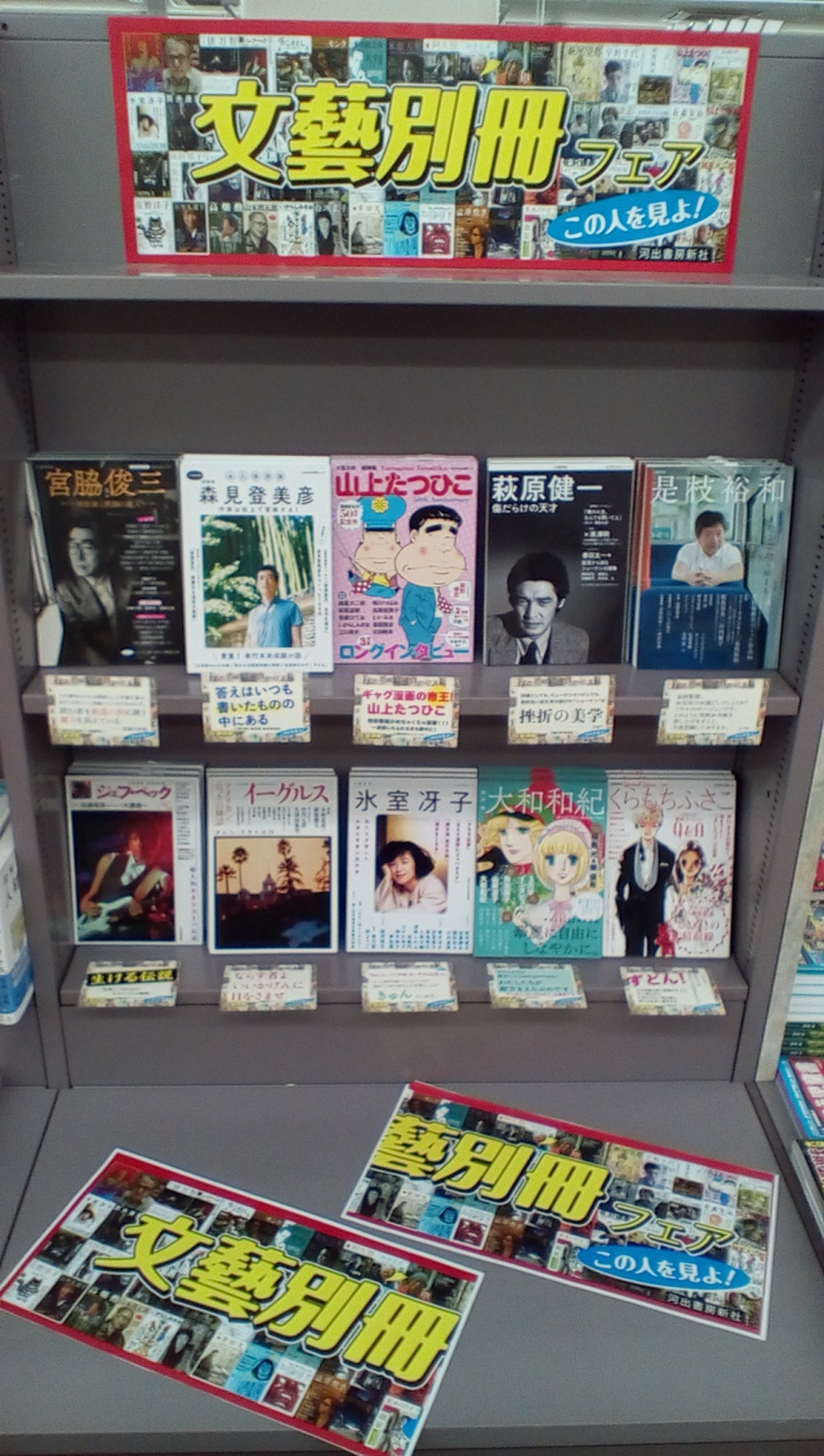 「文藝別冊フェア」この人を見よ!始めました。毎年この時期に行っているので、年の瀬が近づいてきたことを実感します。例年より小ぶりな10点のラインナップになりました。小説家が森見登美彦さん、宮脇俊三さん、氷室冴子さんの3点、漫画家が山上たつひこさん、大和和紀さん、くらもちふさこさんの3点などバランスの取れたものになっております。気になる方を深く知るには格好のテキストです。ぜひご覧ください。「文藝別冊」はこの他にも雑誌コーナーにてたくさん取り揃えております。そちらもどうぞ。