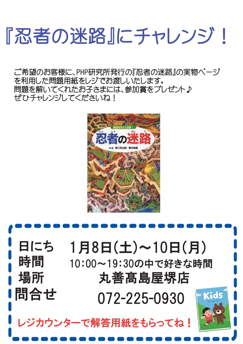 1月8日(土)~10日(月)の3日間、ご希望のお客様に、レジにてPHP研究所『忍者の迷路』の実物ページを利用した迷路の用紙をお渡しいたします。迷路にチャレンジしてくださったお子様にはレジにて参加賞をプレゼント!ぜひご参加ください。