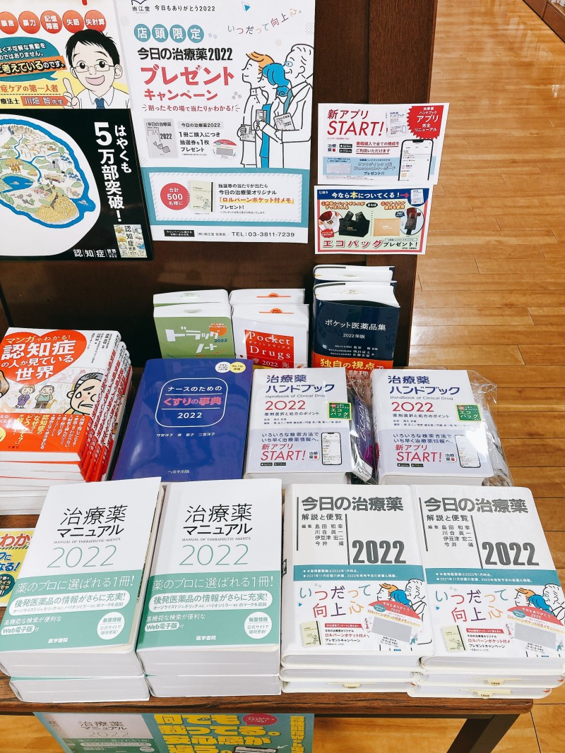 『今日の治療薬2022』(南江堂・税込5,060円)はオリジナルの「ロルバーンポケット付きメモ」が当たるキャンペーンを実施中。また、『治療薬ハンドブック2022』(じほう・税込4,840円)には数量限定で特製エコバックがついています。Web電子版が付いた『治療薬マニュアル2022』(医学書院・税込5,500円)など検索、持ち歩きに便利な機能のあるものもございます。ぜひお手に取ってご覧ください。