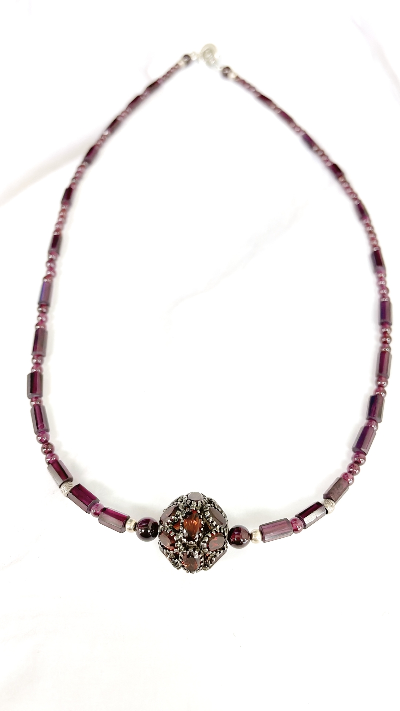 【スリヤ】製作者本人が海外を歩いて集めた天然素材を使い製作した、独創的なアクセサリーをご紹介いたします。写真の商品のガーネットネックレスは、トップをシルバーの台に美しくカットを施したガーネットを一つ一つ爪止めした、全面ガーネットで仕上げております。