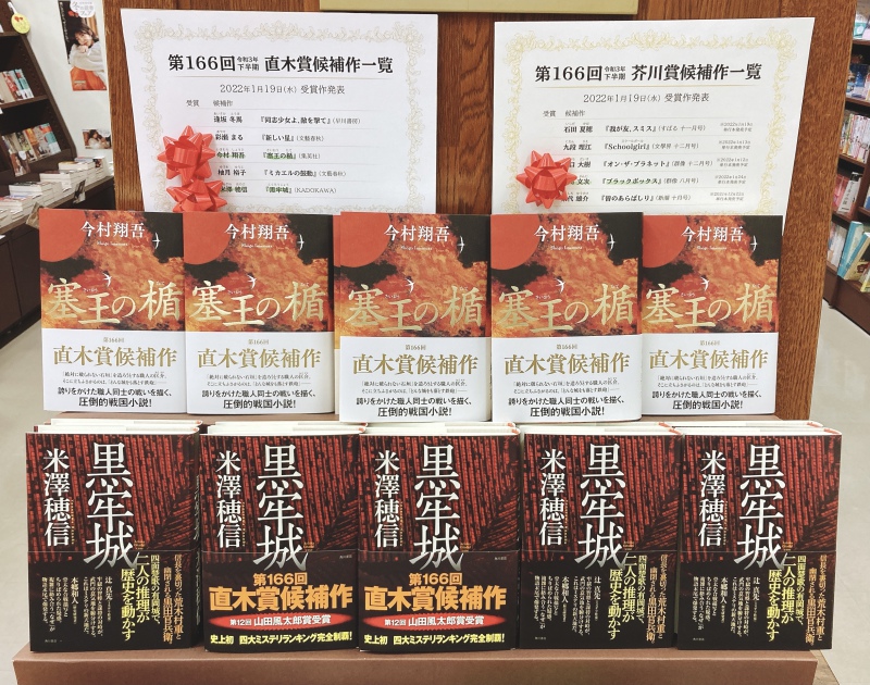 直木賞は、今村 翔吾 さんの『塞王の楯』と、米澤穂信さんの『黒牢城』が受賞しました。おめでとうございます。ということで、フェア展開中です!!直木賞受賞作は共に、戦国時代を題材にした物語。『塞王の楯』は、戦国時代、武将たちの活躍の陰で城の石垣作りに命をかける職人集団「穴太衆」の姿を描いた歴史小説で、幼い頃、戦乱で家族を失い、「穴太衆」に育てられた石垣職人・匡介が主人公です。『黒牢城』は、戦国時代、織田信長に背いて「有岡城」に立てこもった荒木村重が、翻意を促すためにやってきた黒田官兵衛をろう獄に幽閉したという史実を下敷きにした小説です。事件の謎解きというミステリーとしての要素と、戦国の世の価値観や慣習を盛り込んだ歴史小説としての要素を併せ持つ作品です。芥川賞受賞作は、自転車で書類などを運ぶメッセンジャーが主人公の物語。今までの小説とは題材を変え、より人を描こうと試みた意欲作。どうぞお手に取ってご覧下さいませ。