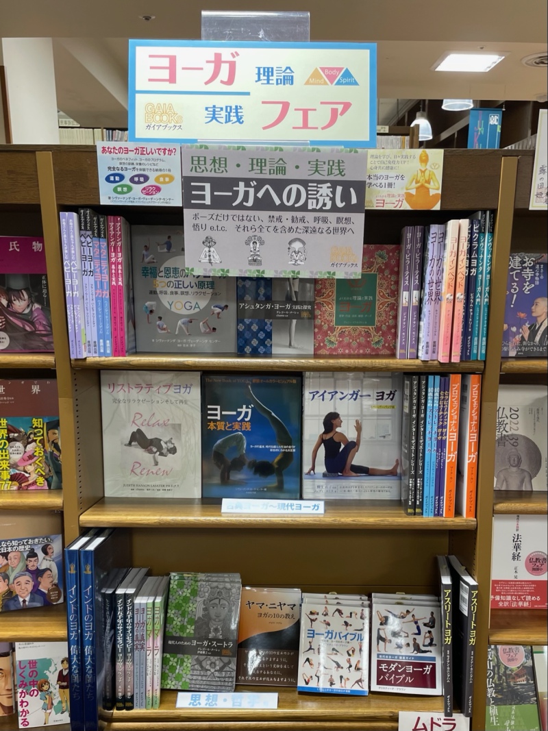 流行りのヨガについて、一歩踏み込んで学びたい方は必見のフェアです。「古典ヨーガ~現代ヨーガ」、「思想・哲学」、「ヨーガ療法」、「ムドラ(手の印)」、「医療に役立つヨーガ」、「アナトミィ(解剖学的)にテーマを分類し、並べています。ポーズだけではない、禁戒・勧戒・呼吸・瞑想・悟りなどなど、ヨーガの深淵なる世界へあなたを誘います。読めばあなたも「ヨガ」ではなく「ヨーガ」と、自身を持って言えるようになるでしょう。「ヨーガフェア」は5階フェアコーナーにて絶賛開催中です。