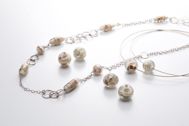 自信作のトンボ玉を用いたジュエリー、オブジェも製作中。