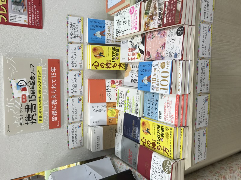 皆様に携えられて15年。ディスカヴァー携書フェア開催中。100万部のベストセラー「うまくいっている人の考え方」や「心の持ち方」のジェリー・ミンチントン はじめ「何をしてもうまくいく人のシンプルな習慣 」ジム・ドノヴァンなど新書っぽくない新書を集めました。この機会にお気に入りの一冊を見つけてみてはいかがでしょう。話題書コーナーで展開中。