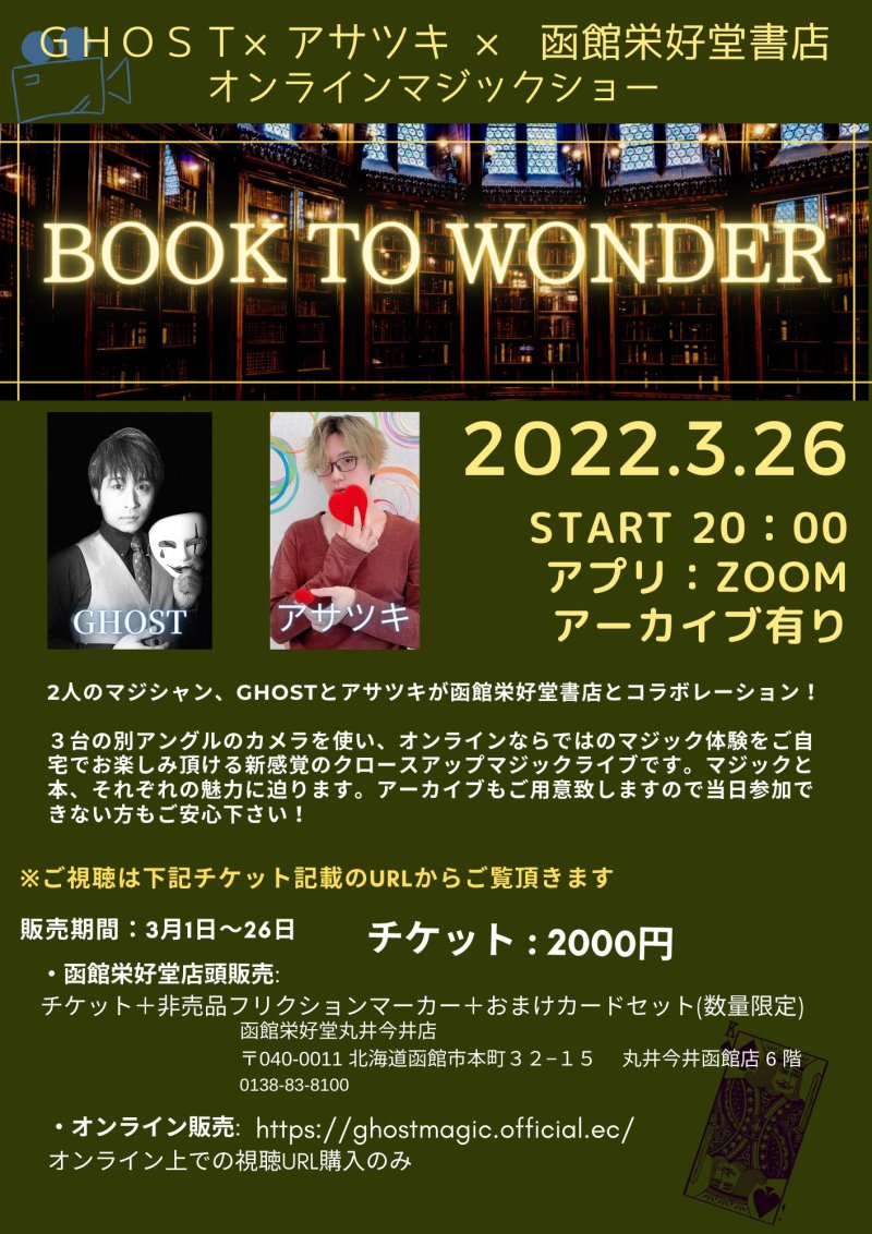 オンラインマジックショーのチケットは、函館栄好堂レジにて販売の他、《GHOST》様のオンラインサイトでも販売をおこないますが、店頭販売限定特典もございますので、是非とも函館栄好堂にてお買い求め下さいませ!