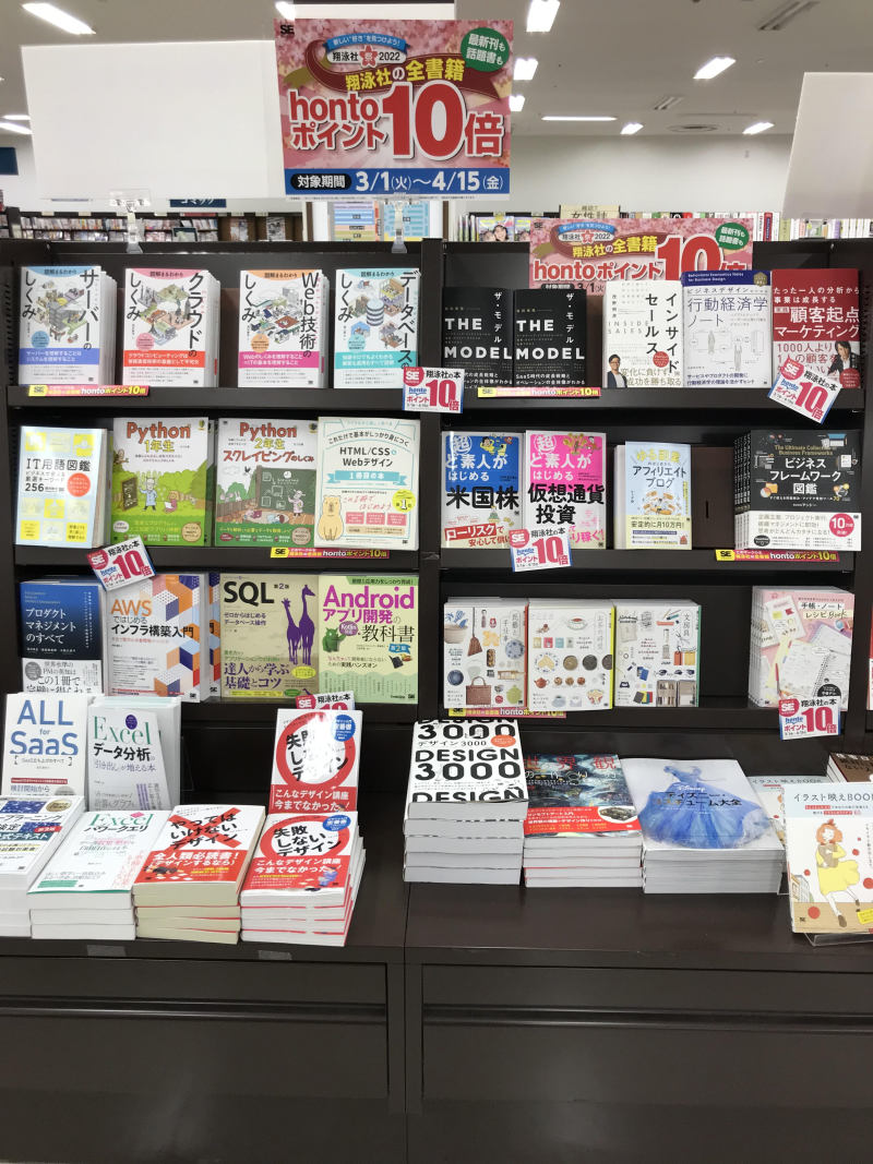 翔泳社春のフェア開催中!初めて学習する人にオススメのPC書やデザイン書など取り揃えております。この春から何か新しいことを始めてみませんか?本との出会いできっかけが見つかるかも!?フェアは入り口付近にございます。この機会にぜひお買い求めください。