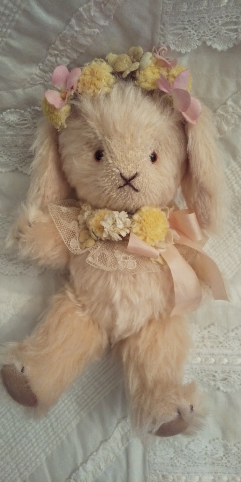 ふわふわバニラ色のロップイヤーです。大好きな野の花を集めて頭に飾りました。