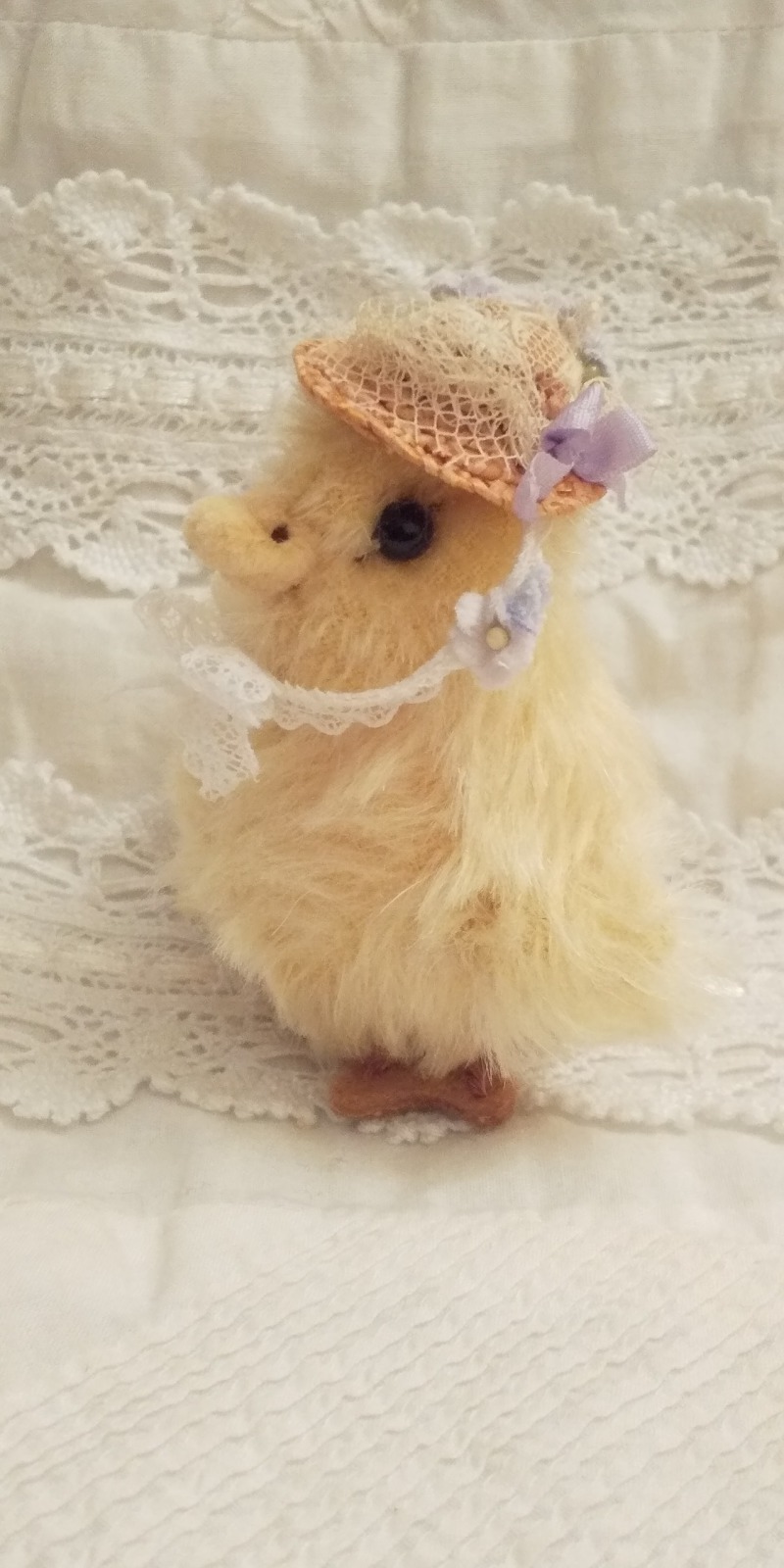 お気に入りの帽子をかぶって、お花畑へお出かけひよこちゃんです。