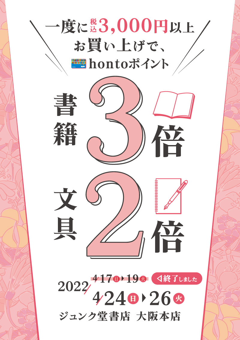 一度に税込3,000円以上お買い上げで書籍3倍・文具2倍キャンペーン(大阪本店)