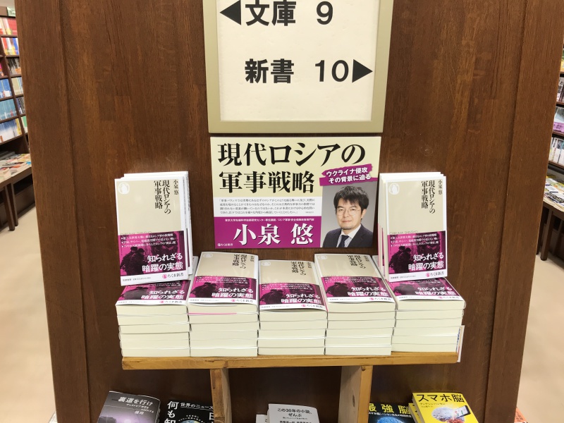 お問い合わせが相次いでおりました『現代ロシアの軍事戦略』小泉悠(ちくま新書)が、再入荷いたしました。防災センター側入り口近くの新書平台にて、展開しています。著者近影入りのパネルが目印です。