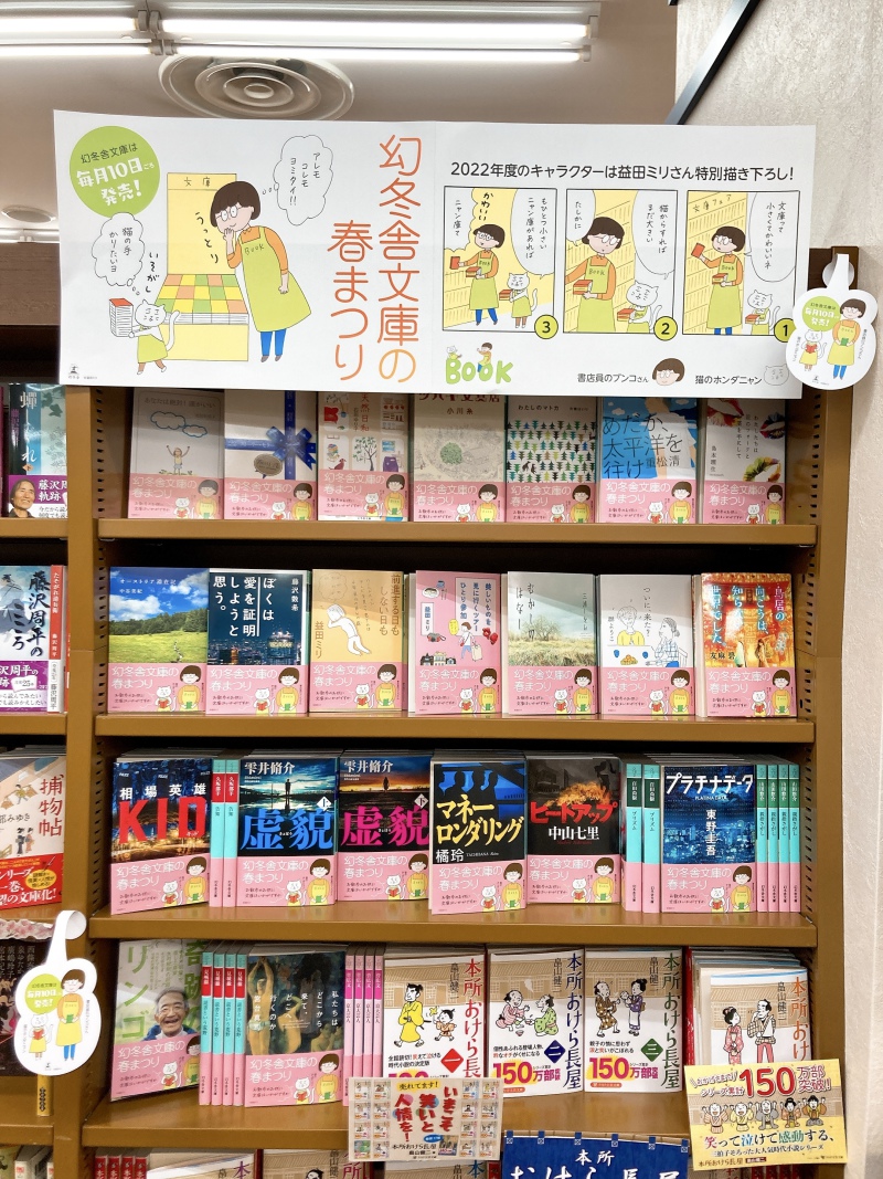毎年恒例!「幻冬舎文庫の春まつり」今年はなんと、益田ミリさん描き下ろしの「書店員のブンコさん&猫のほんだニャン」が登場です!とてもかわいい1人と1匹のポスターが目印。文庫売り場フェア棚で展開していますので、ぜひお立ち寄りくださいね!