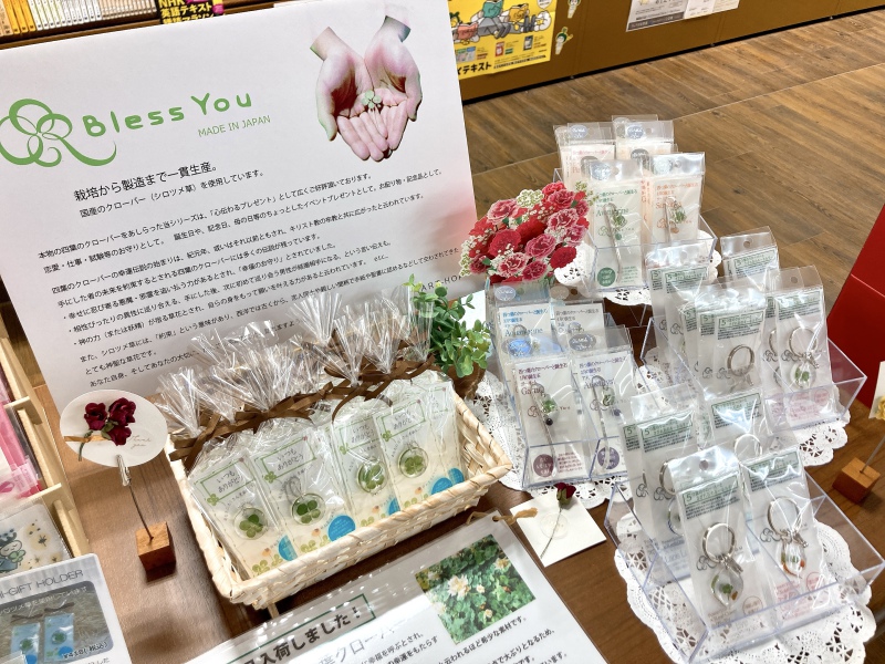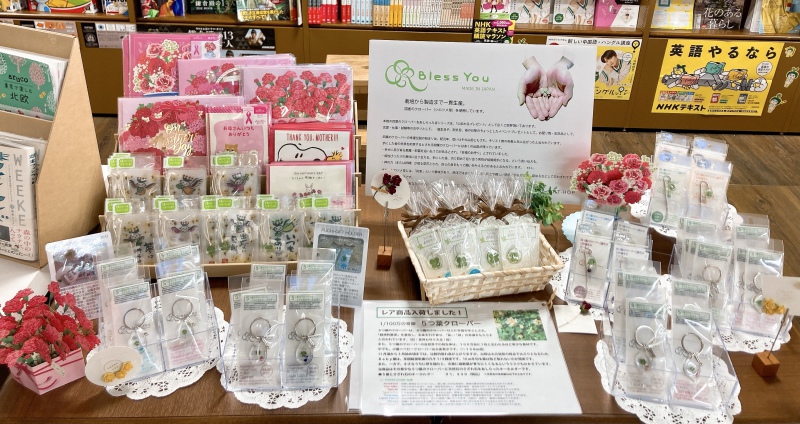 アートホップのクローバーシリーズを話題書コーナー平台にて展開中です。誕生石と四つ葉のクローバーを組み合わせたブックマークや、本物のクローバーを封入したキーホルダーなど、幸運を呼び込んでくれるクローバーアイテムは、母の日のプレゼントにぴったり!キーホルダーには、レアな5つ葉のクローバーのアイテムも!グリーティングカードも一緒に展開していますので、ぜひあわせて手に取ってみてください。