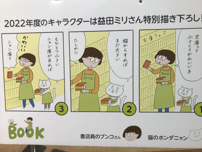 書店員のブンコさんと猫のホンダニャンが文庫棚で楽しくかわいく本を推してます。