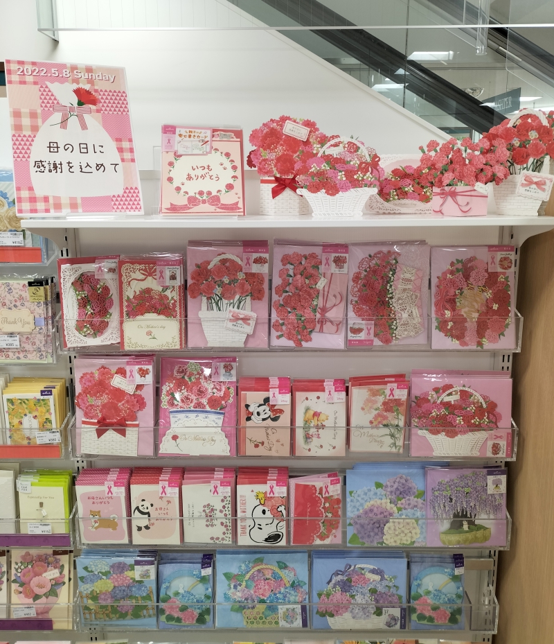 文具コーナーでは、母の日にぴったりのカーネーションのメッセージカードを揃えています。お母さんや普段お世話になっている大切な方へ、普段なかなか言えない「ありがとう」の感謝の気持ちをメッセージカードで伝えてみませんか。