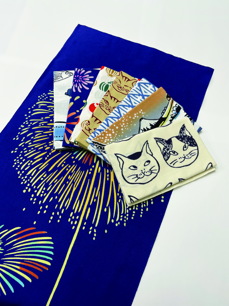 「注染」という伝統の技で熟練の職人が染め上げた手ぬぐいの数々。歌舞伎や季節の絵柄、江戸小紋柄などさまざまな絵柄200点に加え、手ぬぐいを使った小物も取り揃えます。