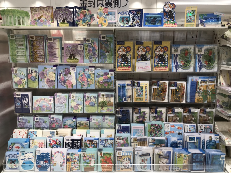 今年もサマーカードが入荷致しました!爽やかな紫陽花柄のカードや、音が流れたり光ったりするカードが続々登場しておりますが、今回のおすすめは、サンリオのメロディーカードです。中でもT.M.Revolutionさんの『HOT LIMIT』のカードは、ご本人のSNSでも取り上げられて話題になりました。描かれたネコちゃんのキメポーズやお洋服もあの熱い曲を彷彿とさせ、ついつい気持ちが盛り上がってしまいます!定番の涼しげで可愛らしいカードも各種ご用意しております。夏のご挨拶にはぜひ当店のサマーカードをご利用くださいませ!