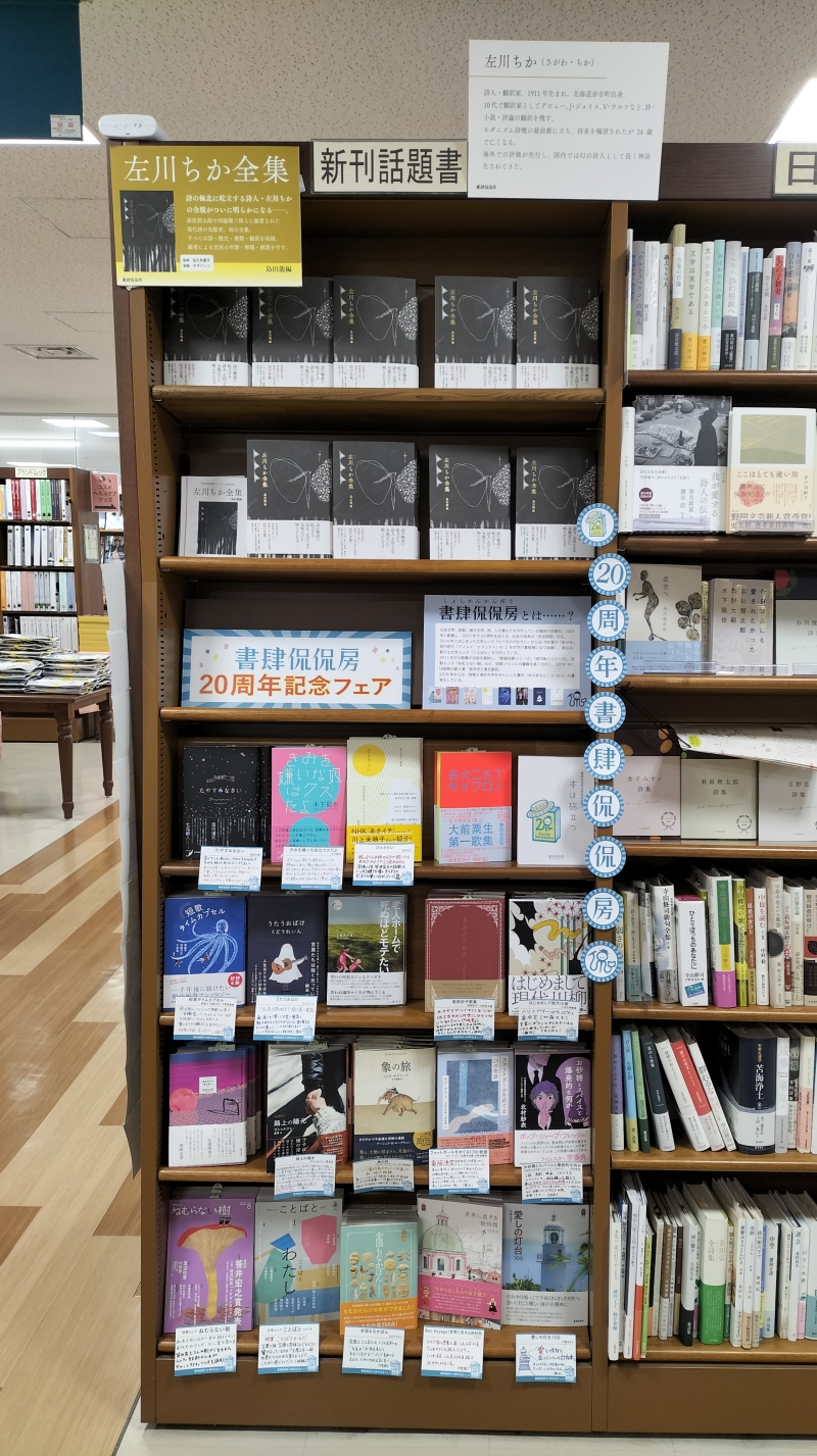 併せて、発売前から話題『左川ちか全集』(書肆侃侃房)発売になりました!モダニズム詩壇の最前衛に立った夭逝の詩人、左川ちかすべての詩、散文、書簡、翻訳を収録。刊行を記念して大きく展開中です。この機会に書肆侃侃房の書籍に触れてみませんか。文芸書フェアコーナーにて展開中です。