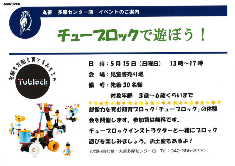 想像力を育む知育ブロック「チューブロック」の体験会を開催します。参加費は無料です。