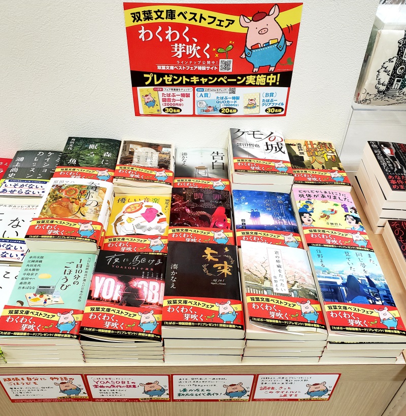 「小説を音楽にするユニット」YOASOBIの恋愛ソングの原作小説集。「夜に駆ける」や号泣「君の膵臓をたべたい」・ベストセラー作家「湊かなえ」など双葉文庫のイチオシを集めたフェアを開催。マスコットキャラたばぶーの図書カードやQUOカードがプレゼントキャンペーンも実施中。話題書コーナーにて展開中。この機会に是非お立ち寄りください。