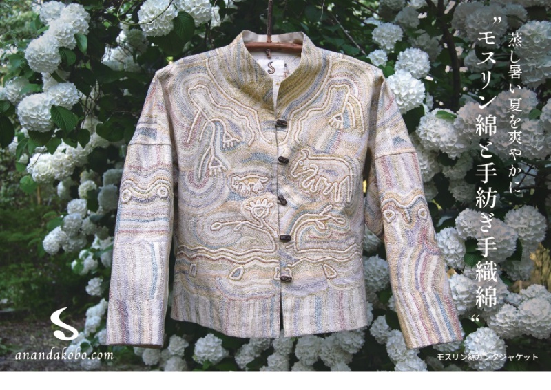 高温多湿の長い雨季をもつインド・ベンガル地方。そこで育まれた極細の手紡ぎ手織りのモスリン綿は日本の蒸し暑い夏を快適なものにしてくれるでしょう。この涼しい布に緻密なカンタ刺繍を施したブラウスや羽織りもの、あわせて植物染手織綿のワンピースなど、オリジナル作品を展示してご来場をお待ちしております。日本の夏を、心地よく楽しく過ごすお手伝いができたらと思っています。