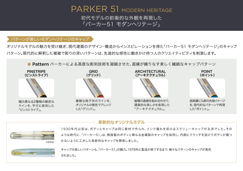 1941年に発売された歴史的名作「パーカー51」に、伝統的なデザインとカラーを継承しながら、レトロモダンに進化した「パーカー51モダンヘリテージ」が新登場!