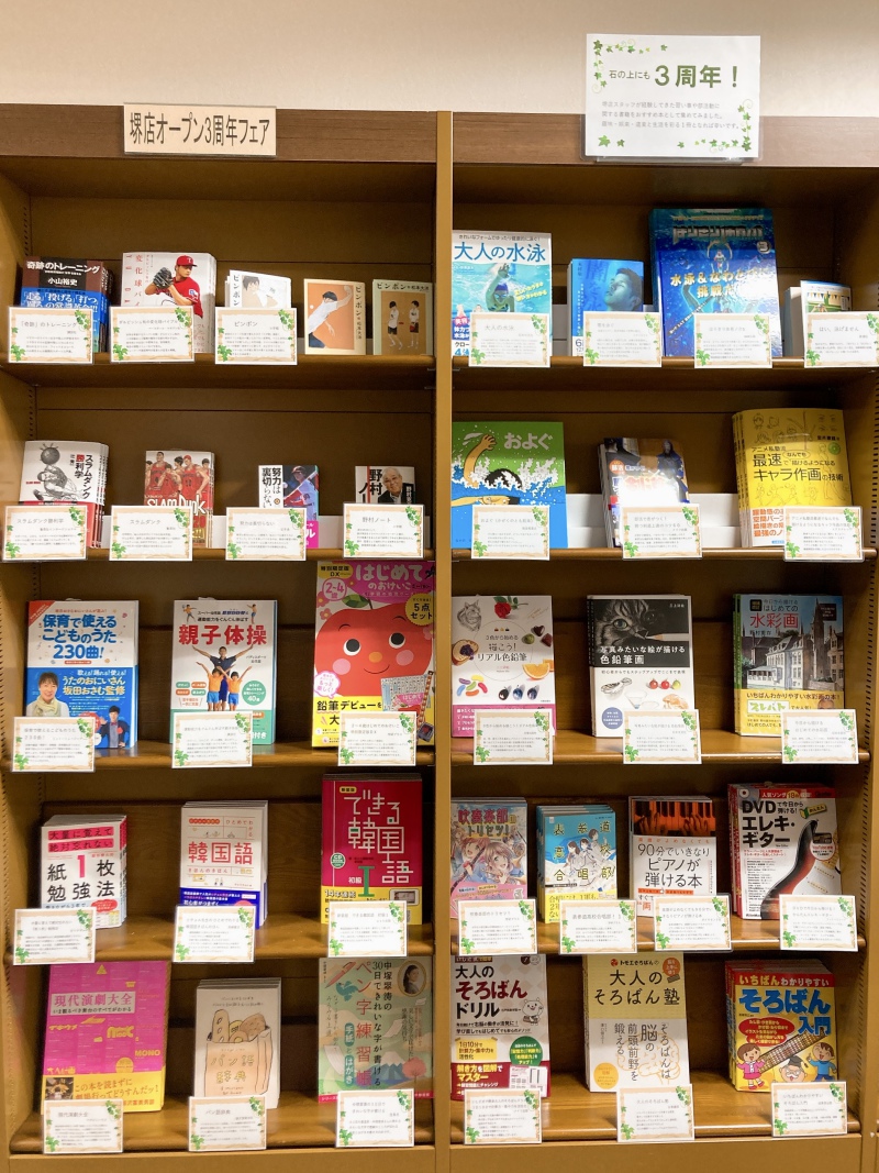 丸善高島屋堺店は6月8日でオープン3周年を迎えることが出来ました!それに合わせて「石の上にも3周年!」というコンセプトのもと、話題書コーナーでは堺店スタッフが経験してきた習い事や部活動に関する書籍をおすすめ本として集めてみました!趣味・娯楽・道楽と生活を彩る1冊となれば幸いです。