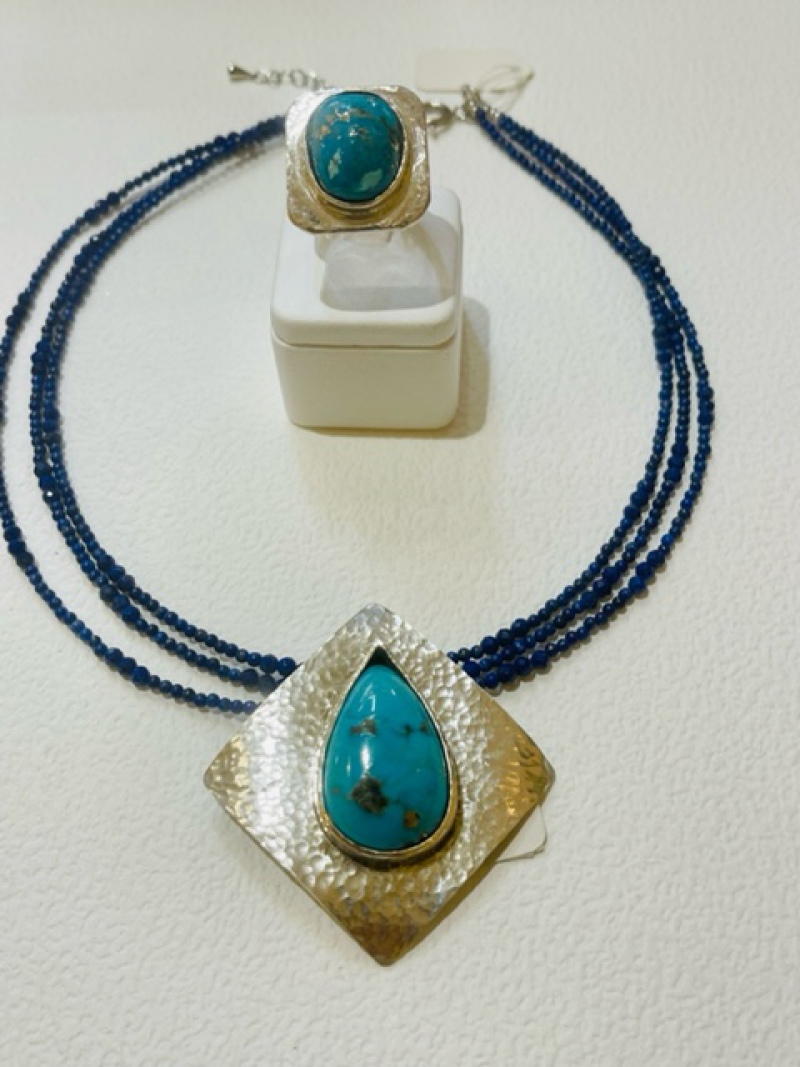 〈天然石工房 マリンスター〉美しい天然石、真珠を用いてアクセサリーを制作するマリンスター。世界で一つだけの創作アクセサリーとなります。写真の商品は、トルコ石の中にパイライトという金色の鉱物が入り込んでキラキラ輝いている珍しいトルコ石で制作しており、個性的な創作アクセサリーになっております。