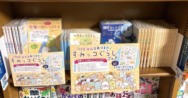 児童書コーナーフェア棚にて展開中のすみっコぐらしの読み物に、今だけ限定!かわいいマスキングシールを封入しています!対象商品は「すみっコぐらしのお友だちとなかよくする方法」「すみっコぐらしの時間の使い方が上手になる方法」「すみっコぐらしの勉強が好きになる方法」「すみっコぐらし ここがおちつくんです」「すみっコぐらし このままでいいんです」「絵本すみっコぐらし そらいろのまいにち」「絵本すみっコぐらし いつでもとなりに」「映画すみっコぐらし とびだす絵本とひみつのコ ストーリーブック」「映画すみっコぐらし 青い月夜のまほうのコ ストーリーブック」の9冊。この機会にぜひお買い求めください!