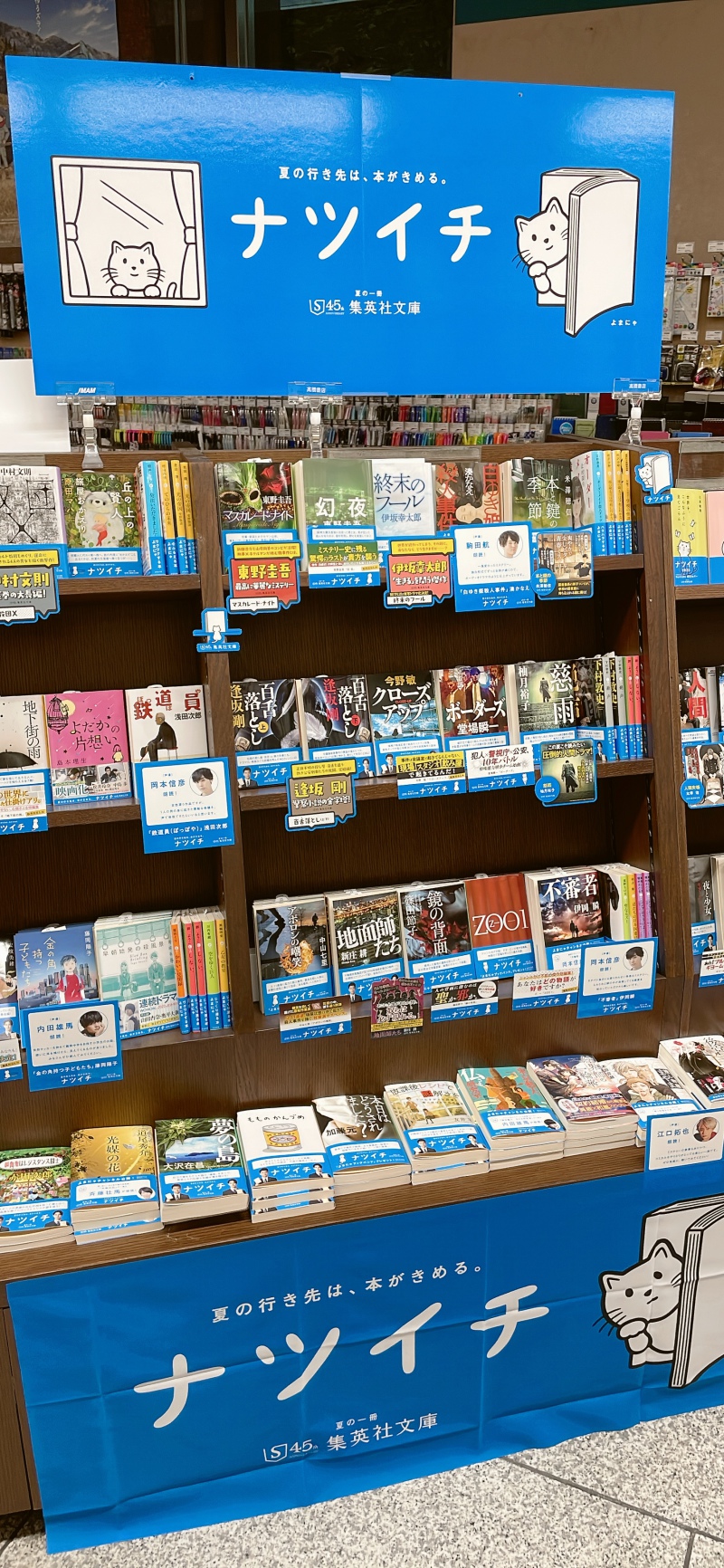 毎年恒例、夏の風物詩となった、集英社「ナツイチ2022」フェアが始まりました!古典となった作品から話題の新刊まで、イチオシの文庫が勢ぞろい!対象作品お買い上げのお客様には、バッグの中でも本が折れにくい「よまにゃブックバンド」をその場でひとつプレゼント。竹内涼真さんと横浜流星さんが表紙の小冊子も店頭で配布しています。入口話題書フェア棚にて展開中です。どうぞご覧くださいませ。
