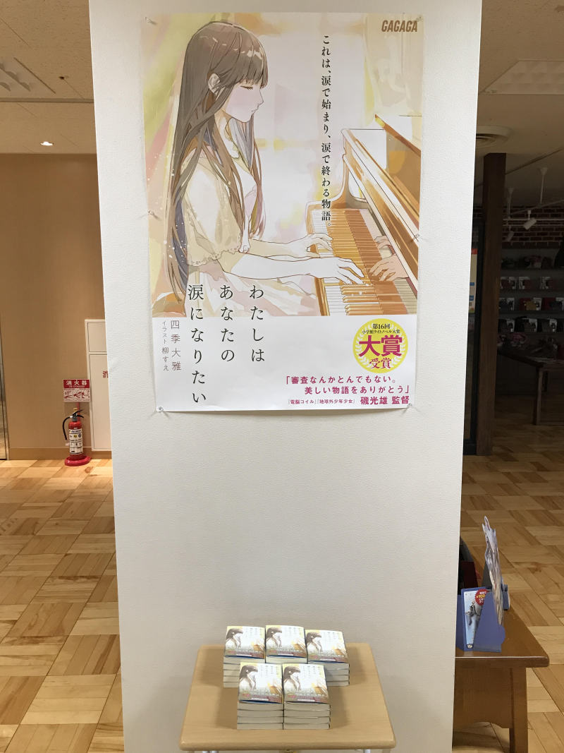 第16回小学館ライトノベル大賞受賞作 『わたしはあなたの涙になりたい』。郡山市出身 四季大雅さんのデビュー作『わたしはあなたの涙になりたい』が小学館ライトノベル大賞に選ばれました。大賞が出るのは5年ぶりだそうです。おめでとうございます。作品は、全身が塩に変わっていく「塩化病」で母を亡くした少年が、一人の少女と出会う恋物語です。主な舞台は郡山市で、うねめまつりや猪苗代湖、阿武隈川なども描かれています。発売日には四季さんが当店にご来店されました。この夏、多くの方に読んでもらいたい、当店イチオシの一冊です。みなさまのご来店をぜひお待ちしております。