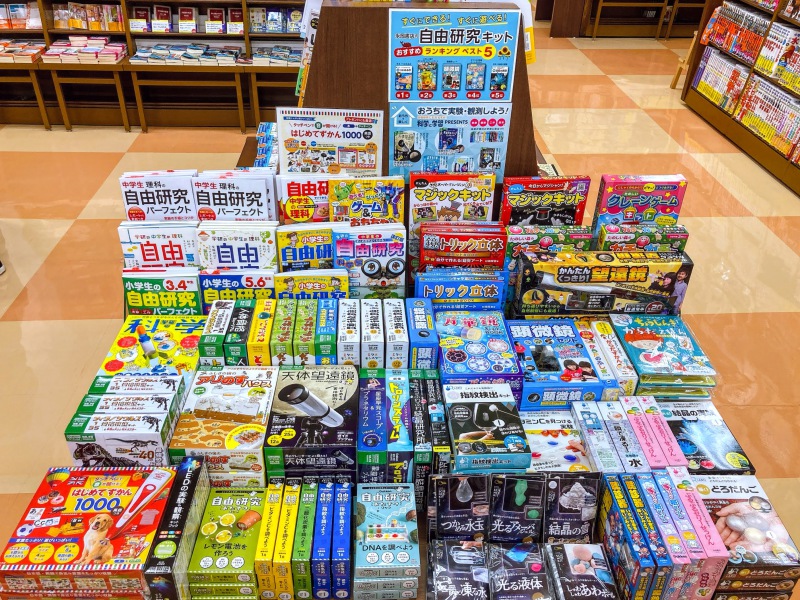 夏休み真っ只中です。猛暑の中、お子様たちは遊びやお出掛けで充実した毎日をお過ごしかと思います。8月の声を聞くとそろそろ宿題も心配になってきますよね。特に自由研究は時間と手間がかかるしアイデアが、とお困りのご家族のために自由研究のアイデア本やキットを多数ご用意し、自由研究フェアを開催中です。市販キットにひと工夫加えてオリジナリティを出すのも楽しいですね。児童書・図鑑売り場近くの特設コーナーにございますのでぜひご活用くださいませ。