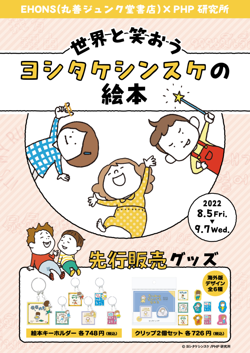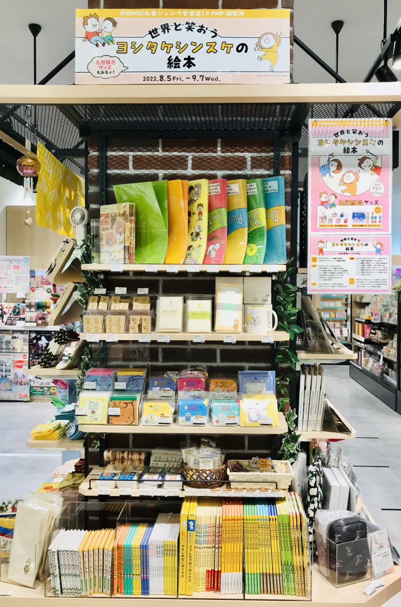 『りんごかもしれない』『りゆうがあります』などで人気の絵本作家・ヨシタケシンスケさんのフェアを開催中!ファイルやスタンプ、マグカップなどEHONSオリジナルの文具をはじめ、他では手に入らない先行販売のグッズ「絵本キーホルダー」「クリップ」もご用意してお待ちしております!あの絵本のあの場面がデザインされたグッズはどれもかわいくてついつい見入っちゃいますよー