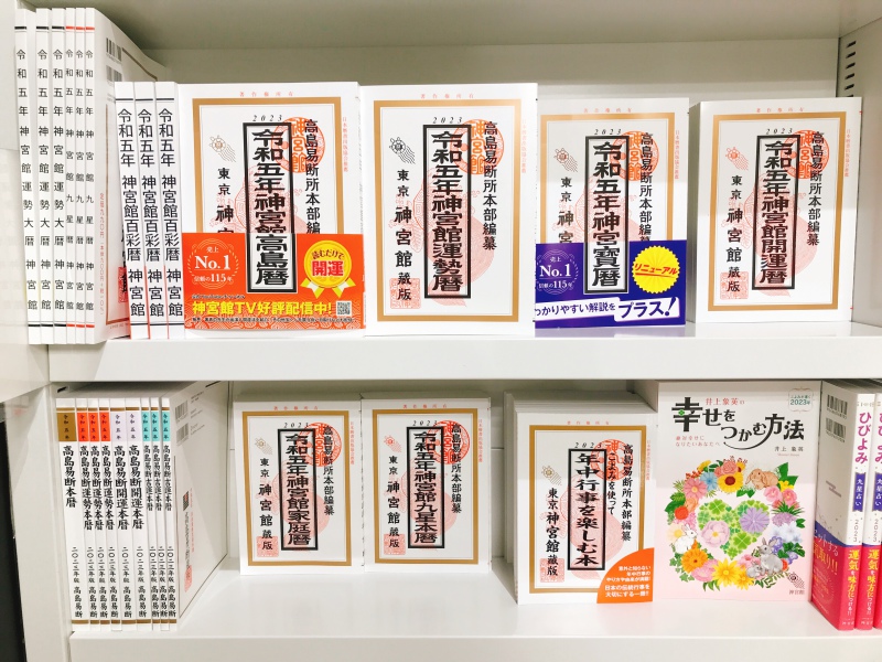 令和五年神宮館暦が入荷いたしました。月ごとの運勢が調べられるものから、より詳細な暦まで、さまざまな種類を取り揃えております。来年の大切な予定の参考にぜひご活用下さい。レジ前フェア台にて展開中です。9月上旬からは、店前にて大きく展開いたします。