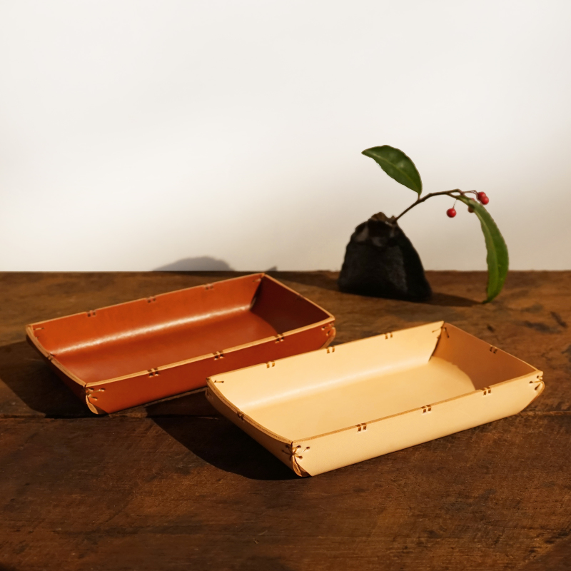 私たちは、職人の「手」と「素材」によって作品が生まれ、それを「使い手」と「時間」によって味わいが加わり、個性的な作品になると考えています。そのため、とてもシンプルなデザインで長く使えるように丈夫に制作しています。革は環境に優しいタンニン鞣しを使用し、経年変化を楽しめる「ヌメ革」、防虫防腐効果や耐水性に優れた柿渋を手染めした「柿渋革」の2色です。