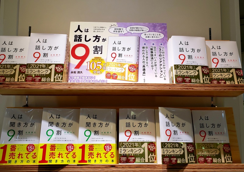2021年の年間ランキングで1位になった「人は話し方が9割」永松茂久(すばる舎)話し方をちょっと変えるだけで、仕事もプライベートも大きく好転する! 「あなた」を多用して自分のファンを作る、肩書き・立場によって話し方を変えないなど、楽しく会話できる「とっておきの秘訣」を紹介。もう会話でなやまない!「人は聞き方が9割」も同時展開中。話題書コーナーにて。