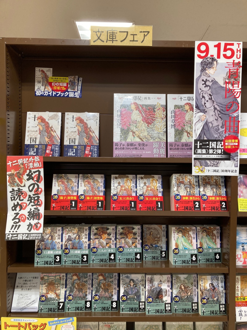8月25日発売の『十二国記30周年記念ガイドブック』に合わせ、文庫棚にて【十二国記激推しコーナー】を展開してます。これまでに出た本の表紙や挿絵などを手掛けた山田章博による第1集目の画集や、十二国記全作品の文庫本も勢揃いで置いております。そもそも“十二国記”とは何かですが、1991年から読み継がれる作家・小野不由美の代表作で、神仙や妖魔の存在する中国風の異世界が舞台の物語。この異世界には十二の国があり、政治を行う王・理想や野望を抱く官吏・市井の民など、多様な立場の人々がそれぞれの国で起こる過酷な運命のもとで必死に生きる姿を描いたファンタジー小説シリーズです。15冊の文庫が出ている中、完結がまだされていない作品で30周年を迎えた今、ファン待望の幻の短編『漂船』が収録された、目一杯十二国記を楽しめる記念ガイドブックが発売されました。さらに9月には画集の第2集目も発売が予定されており、まだまだ盛り上がりが見られそうです。こちらのコーナーは9月下旬頃まで展開予定で、ジュンク堂書店員によるアツい小冊子も一緒に置いてあります。ぜひとも御覧くださいませ。