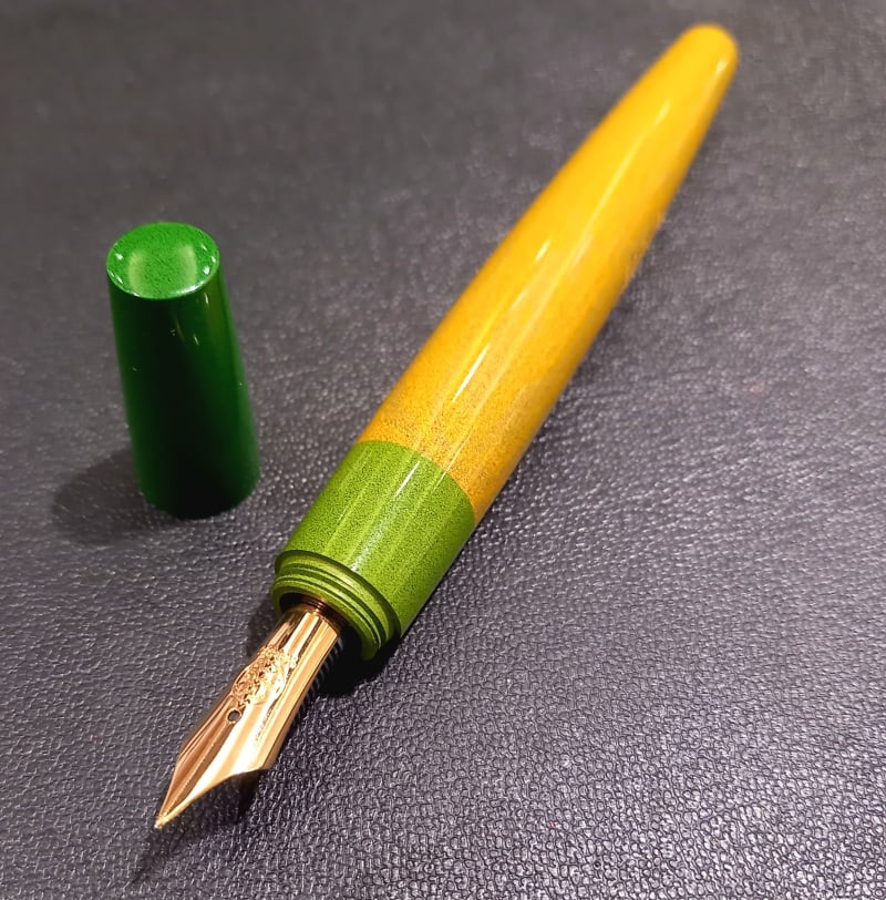 ペンドクター宍倉潔子氏監修によるオリジナルの配色を施した日本橋モデルの第4弾。安定した筆記が魅力の低重心設計です。キャップが葉、軸が果実、さらにその奥には黄色のコンバーターで檸檬感を際立たせました。ペン先には檸檬爆弾をイメージした刻印が入ります。