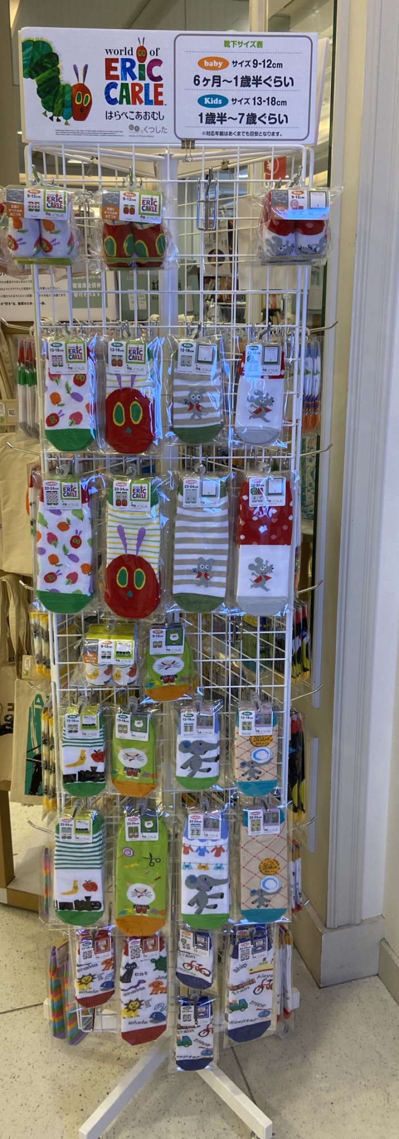 「えほんやさんMOE」の人気商品、絵本のくつしたを当店でも取扱開始しました!絵本の人気キャラクターのくつしたベビーサイズ、キッズサイズ、レディースサイズで取扱しているので、家族でお揃いにもできます。1Fレジ横のエレベーター前で展開中です、ぜひお気に入りの柄をみつけてください!