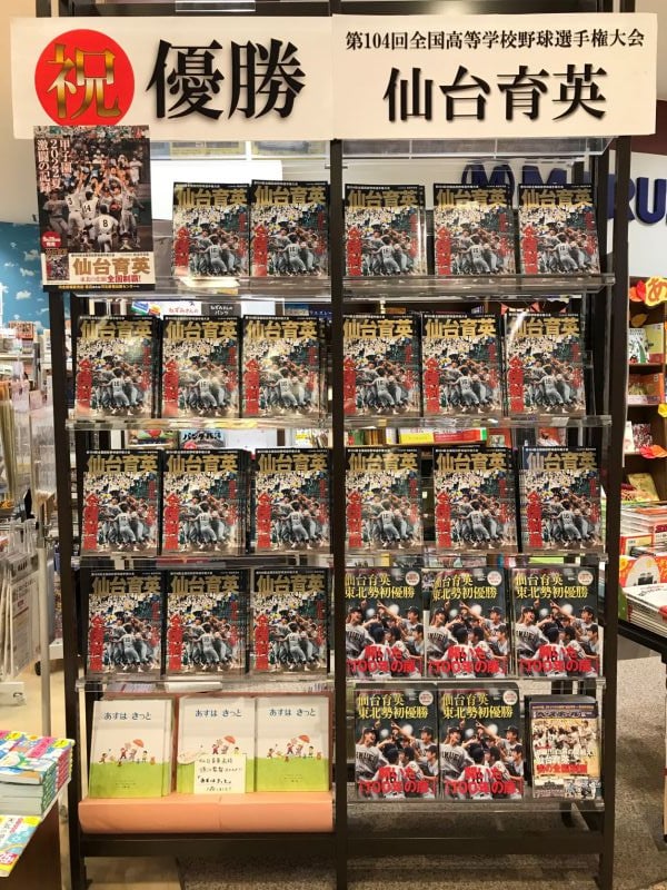 ご家族や在校生の方、東北のみなさんだけでなく、全国にいらっしゃるであろうOB、OGや、親戚の方、野球ファンの方もいかがでしょう。須江監督オススメの絵本『あすは きっと』も一緒に展開中ですのでどうぞお立ち寄りください。