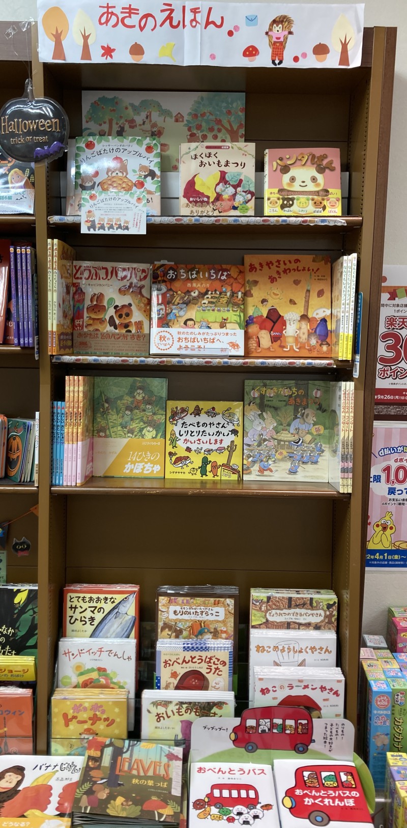 児童書コーナーにて、秋をテーマにした絵本を展開中でございます。旬の食べ物に紅葉やお祭りなど季節を感じ楽しめる絵本を選書しご用意しております。ご家族やお友達とご一緒に可愛い絵本のキャラクター達と秋の魅力を味わってみるのはいかがでしょうか。気になるタイトルがございましたら、是非お手に取ってご覧ください。