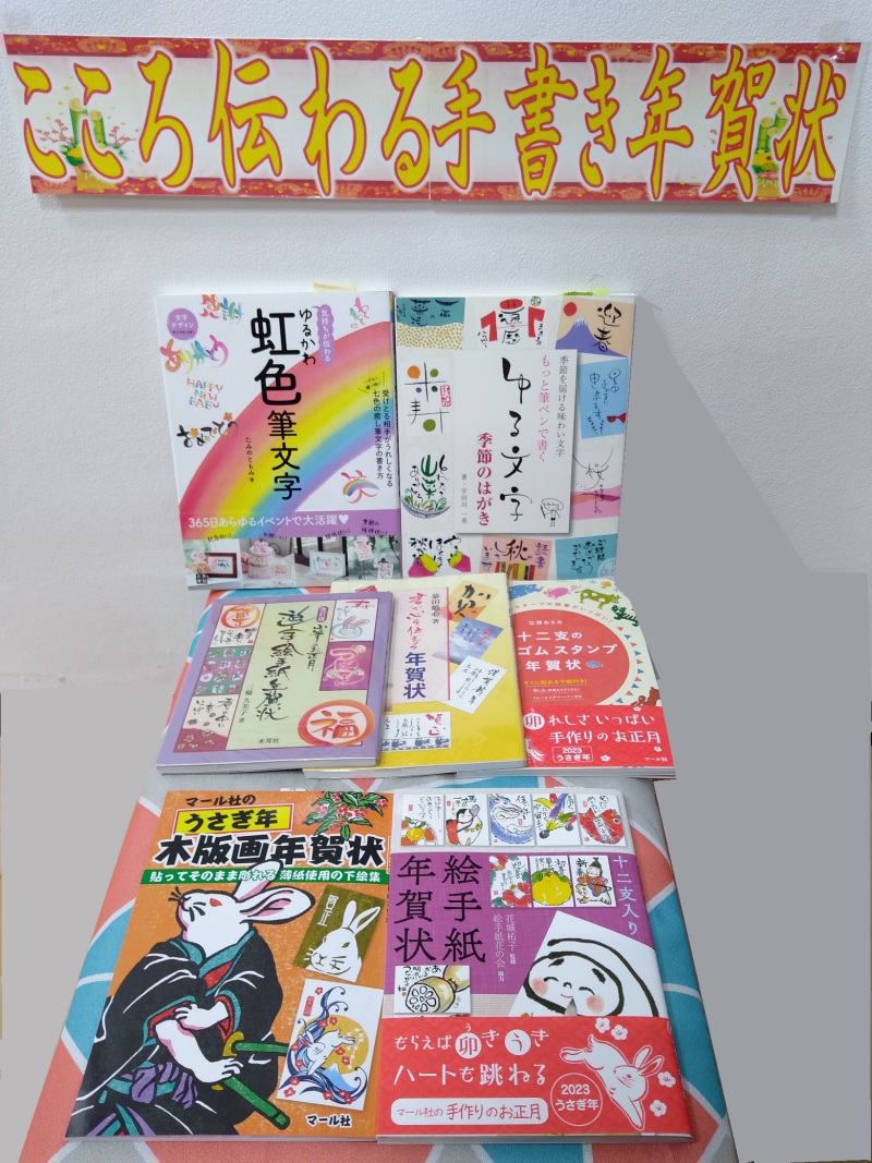 ジュンク堂書店芦屋店ではただ今、手づくり年賀状のフェアを開催しています。水墨画や版画、消しゴムはんこといった定番のものに加えて、最近人気の絵具や色鉛筆を使ったイラストなど、バリエーション豊かな手づくり年賀状の書籍をご用意しています。また、かわいい季節絵、味わい深い挨拶文のためのゆる文字など、年賀状を楽しくおしゃれに飾るテクニックや素材もご紹介します。