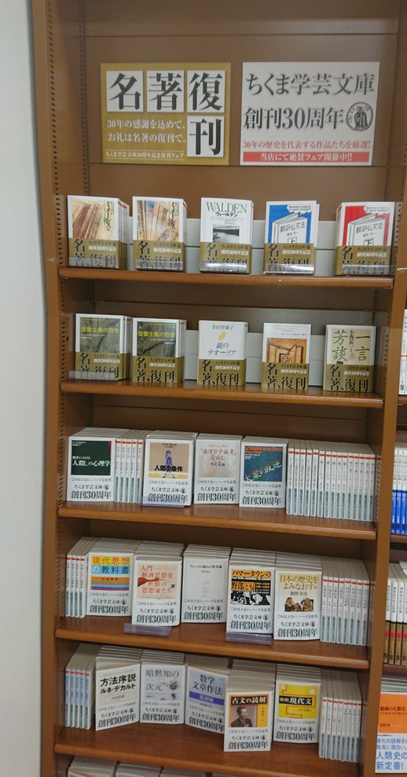 ちくま学芸文庫は創刊30周年です。記念して30年の歴史を代表する作品たちを厳選して、並べています。そして30周年の感謝をこめて名著が復刊されました。復刊された名著も要注目です。創刊時の編集長のあいさつは直球思考宣言です。しなやかな感性とこれ以上ないハードな思考に根ざしたちくま学芸文庫は読者に充分すぎる期待に答える作品たちだと確信します。