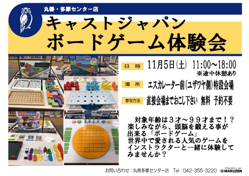対象年齢は3才~99才まで!?楽しみながら、頭脳を鍛える事が出来る「ボードゲーム」。世界中で遊ばれている人気の「ボードゲーム」をインストラクターと一緒に体験できます。参加は無料で予約も不要です。体験をご希望の方はエスカレーター前(ユザワヤ側)特設スペースまで直接お越し下さいませ。