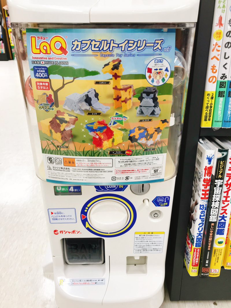 パーツを組み合わせて作るブロック玩具「LaQ」。気軽に楽しめるサイズが、ガチャガチャになりました。シリーズは恐竜・動物。ガチャを引く、組み立て・飾る、いろいろな楽しさが一緒で、400円。山側エレベーター側、児童書コーナー入口にございます。ぜひお子様と一緒にまわして下さい。