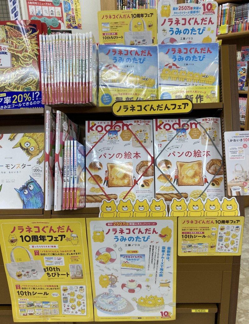 みんな大好き「ノラネコぐんだん」シリーズが10周年を迎えました。お子様はもちろん、大人までも夢中にさせてしまう魅力にあふれた人気作品です。10周年にあわせて豪華クルーズ船を舞台にした最新刊「ノラネコぐんだんうみのたび」が刊行されました。今ならフェア特典としてちびトートバッグがついてきます。でかトートバッグが付録としてつく「kodomoe」12月号とあわせてどうぞ!当店3階児童書売り場にて展開中です。