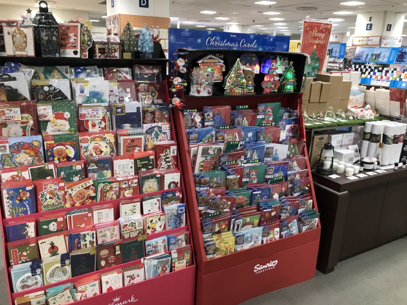 多摩センターの街もすっかりクリスマスムード!イルミネーションが綺麗です。当店の文具コーナーでもキラキラと電飾が輝き、音楽を奏でるクリスマスカードが多数入荷しております。海外の方へのご挨拶に人気の和風クリスマスカードやお洒落で落ち着いたデザインの輸入カード、組み立てると小さなツリーが出来上がるもの等、各メーカーが趣向を凝らしたクリスマスカードがところ狭しと並んでおります。また、ラッピング用品コーナーでもクリスマス用のラッピング用品が多数入荷しております。サンタのシールやトナカイのクリップ、クリスマスならではのキラキララッピングアイテムにプレゼントを詰め込んで、思いを伝えてみては如何ですか?ご来店の際には是非お立ち寄り下さいませ。
