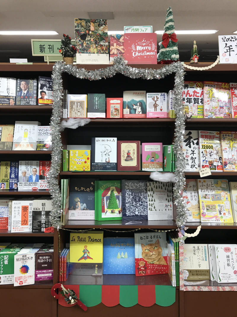 今月はクリスマスフェアを開催!『星の王子さま』や『モモ』といった定番のアイテムから、星新一さんのショートショートやヨシタケシンスケさんの話題作のクリスマス仕様絵本まで、大人から子どもまでワクワクする絵本・児童書を集めました。2021年3月の日本発売以来、大ヒットを続ける『ぼく モグラ キツネ 馬』もございます。通常の絵本・児童書棚やコミック棚も、クリスマス仕様となっています。当店は土日が定休日のため、どうぞ23日までにプレゼントの準備にご活用頂けますと幸いです。