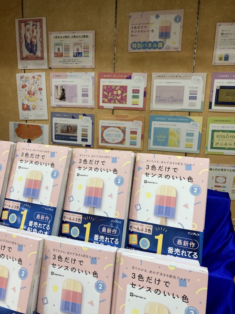 『3色だけでセンスのいい色2』大人気デザイン本の第2弾を記念したパネル展が開催中です。悩みがちな色使いが、たった3色の色使いで決まります。3色でセンスの良し悪しが決まるなんて驚きです!第1弾でメキメキセンスが良くなったら、この第2弾でさらに突き抜けた配色センスを手に入れましょう。本書を活用すればプロ並みの配色センスが身につきます。